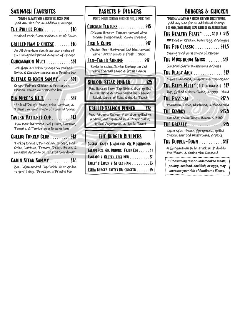 When you step into Cheers Etcetera Menu, located at 504 3rd Ave E in Pablo, MT, you’re in for a relaxed, fun dining experience. Known for its welcoming atmosphere, the menu here has something for everyone, whether you’re craving hearty comfort food or lighter fare. From sizzling burgers and crispy fries to flavorful salads and sandwiches, each dish is crafted with fresh ingredients. Don’t forget to check out their signature drinks, which pair perfectly with whatever you choose. With a variety of options and a laid-back vibe, it’s the perfect spot to unwind and enjoy a satisfying meal. Whether you're stopping by for a quick bite or settling in for a longer hangout, Cheers Etcetera Menu always delivers tasty, casual dining.
